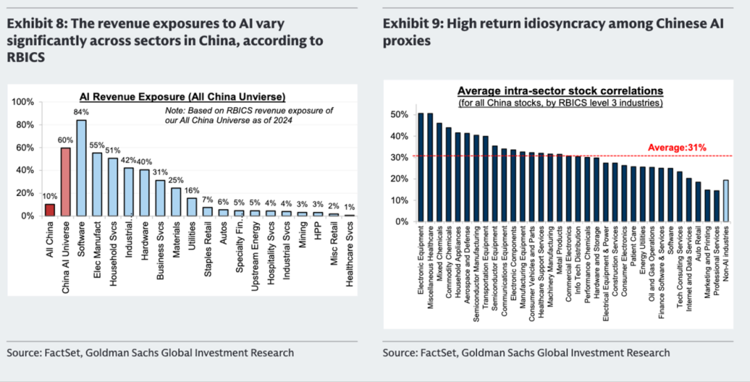 16、根据FactSet对中国上市公司的收入分析,人工智能(AI)相关收入敞口在各行业间分布极不均衡。其中,软件行业的AI收入敞口高达84%,电子制造业和家庭服务业分别达到55%和51%,而医疗保健等行业的敞口则低于3%。与此同时,中国各行业内部的个股平均相关性仅为31%,反映出高度的回报特异性。这种收入结构的巨大差异与个股走势的低相关性,意味着在中国AI投资领域,企业自身的业务基本面是核心驱动因素,而非宽泛的行业主题。