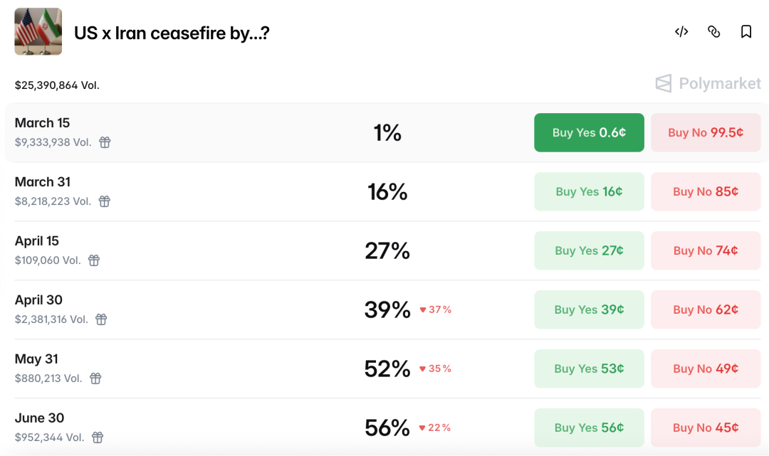 先更新下:目前市场对美伊月内停战的预期只剩16%。