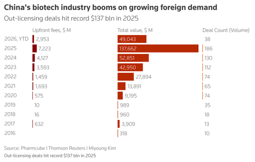 18、由于面临专利悬崖与研发成本削减的压力,全球大型药企正加速从中国获取创新药物管线,推动大中华区对外授权许可(out-licensing)交易总额在2025年达到创纪录的1377亿美元。这一趋势在2026年进一步升级,截至2月中旬,平均单笔交易规模已攀升至13亿美元,较2025年增长76%。该热潮主要源于中国在化学及分子研究领域的成本效益,特别是在抗体药物偶联物(ADC)等前沿领域,中国贡献了全球近90%的授权活动,为跨国药企补充产品线提供了规避高昂内部研发成本的途径。