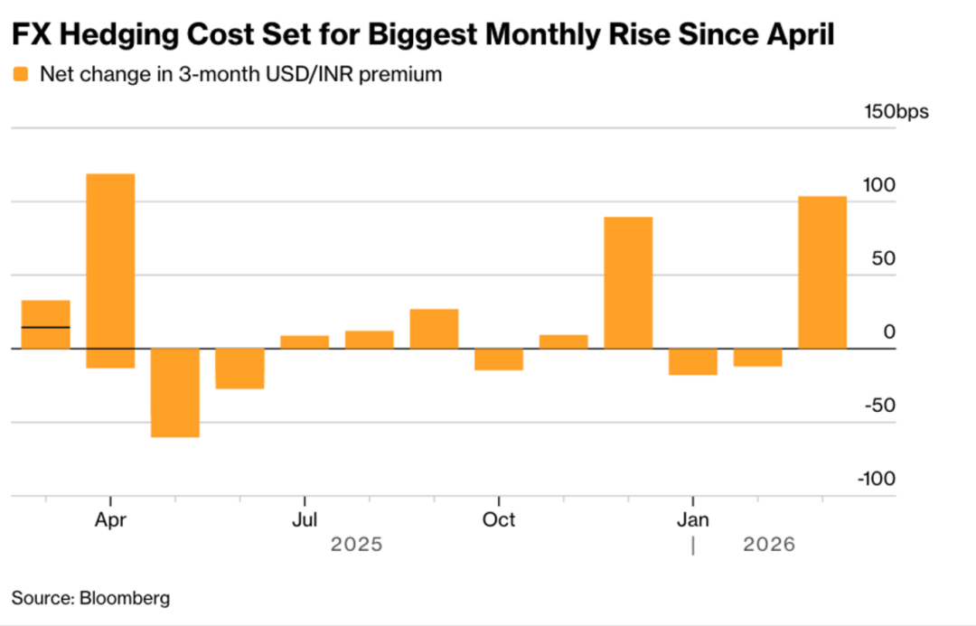 9、因原油价格飙升导致进口账单增加,印度卢比汇率跌至92.3638兑1美元的历史新低,这促使印度进口商紧急寻求外汇对冲,从而推高了货币保护成本。数据显示,印度卢比三个月期的对冲成本本月已累计上涨超过一个百分点,创下自2025年4月以来的最大单月涨幅。进口商的避险需求激增,同时出口商因预期卢比会进一步贬值而推迟卖出美元,加剧了市场供需失衡。摩根士丹利指出,不断上升的对冲成本和经其调整后减弱的资产回报,可能会在短期内削弱外国投资者对印度资产的兴趣。