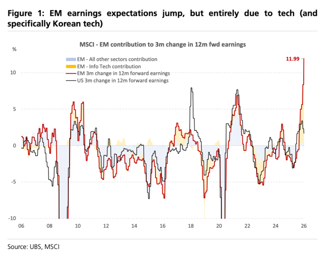 5、新兴市场盈利预期过去一个月出现二十年来最强劲的上调,但其中94%的增幅由信息技术板块贡献。在此之中,韩国又占据了绝对主导,贡献了75个百分点的上调。其核心逻辑在于人工智能供应链中DRAM存储芯片已成为关键瓶颈,分析预测供不应求的局面将延续至2027年第四季度,价格上涨将驱动三星、SK海力士等企业的盈利能力升至创纪录水平,其未来数年现金流或将超过美国超大规模数据中心服务商的总和。