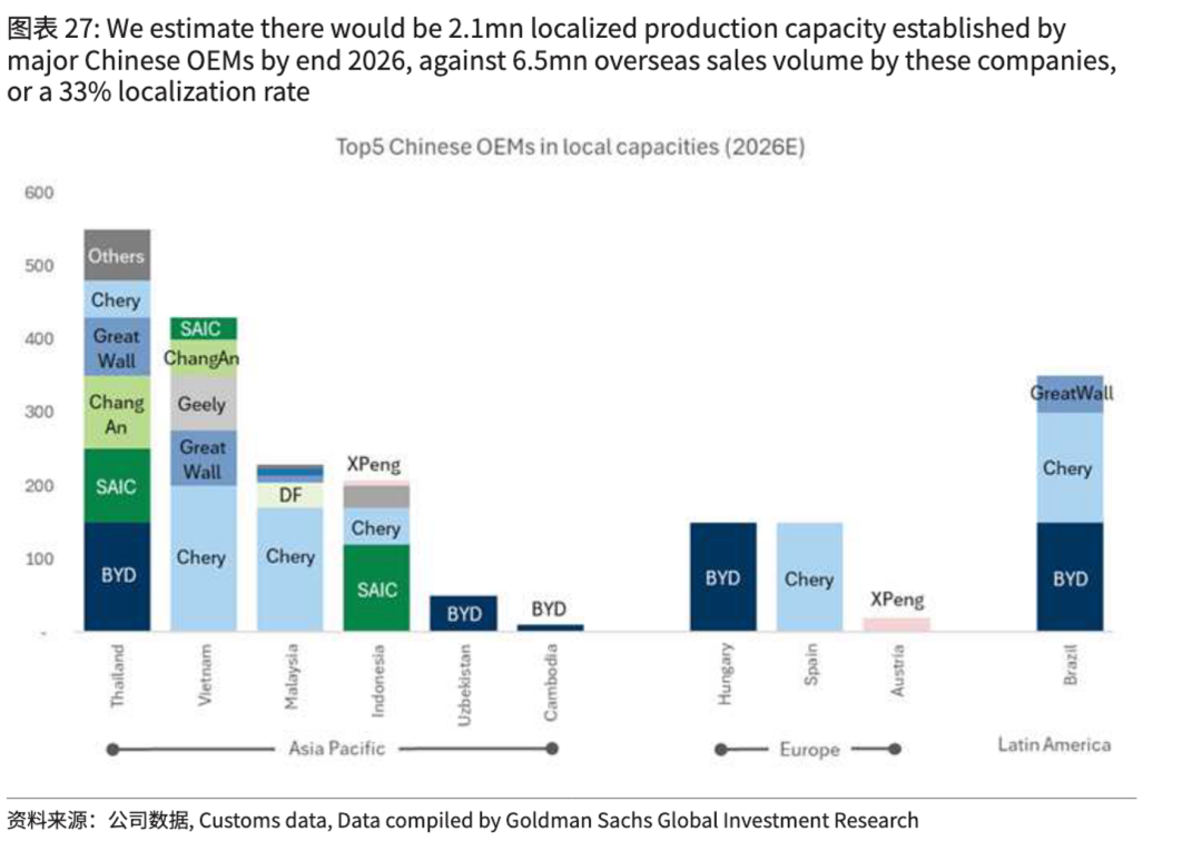 4、为应对海外市场日益增长的关税风险并满足地方政府的产业要求,中国整车厂正加速推进生产本地化进程,预计至2026年底将建成210万辆的海外总产能,相对于届时650万辆的海外总销量预测,本地化率将达到33%。在这210万辆的产能规划中,亚太地区以150万辆的规划产能(占比69%)占据绝对主导,主要集中在泰国、越南、马来西亚和印度尼西亚等国。拉丁美洲的产能规划为35万辆(占比16%),目前全部位于巴西。欧洲则规划了32万辆(占比15%)的产能,主要落地于匈牙利和西班牙。