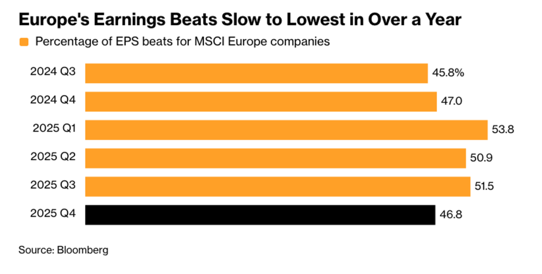 5、MSCI欧洲指数成分公司中,2025年第四季度每股收益超预期的企业比例降至46.8%,为过去一年多以来的最低水平。