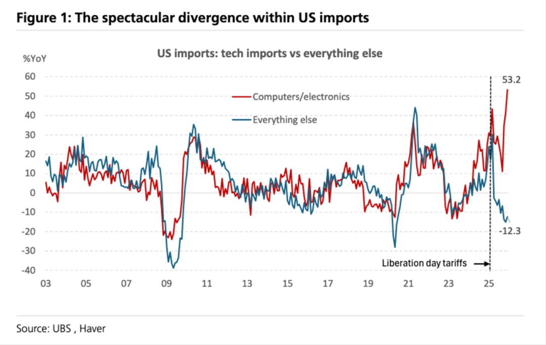 3、美国进口额所表现的强势完全受到计算机与电子产品进口激增推动。去年12月该类别进口在人工智能需求驱动下同比飙升53.2%。若剔除占总额22%的科技产品,其余所有商品的进口额实际同比大幅萎缩12.3%,且在27个非科技进口类别中,有26个均处于收缩状态。