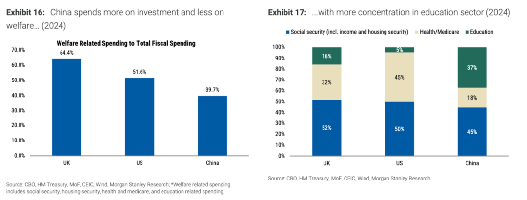 8、中国在财政支出结构上与其他主要经济体存在显著差异,其福利相关支出占总财政支出的39.7%,低于美国的51.6%和英国的64.4%。在福利支出的内部分配上,中国将高达37%的资金投向教育领域,而社会保障与医疗健康的占比分别为45%和18%。这一结构与英美不同,后者的社会保障与医疗合计占其福利开支的80%以上,教育投入占比则不超过16%。