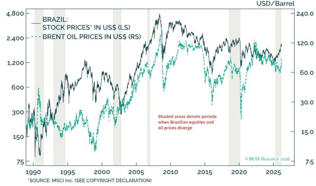 11、巴西股市与全球油价之间历史上的正相关性,但在原油价格出现大幅且持续的剧烈波动时往往会发生逆转。因此,伊朗冲突引发的油价变动幅度和持续时间,而非仅仅是方向,将是决定巴西市场走向的关键。随着油价持续急剧攀升,不仅将通过冲击全球经济增长来拖累巴西资产,更重要的是,由此引发的通胀反弹将可能迫使巴西央行在即将到来的三月会议上放弃降息,转而维持利率不变,从而移除了此前支撑股市的关键利好。