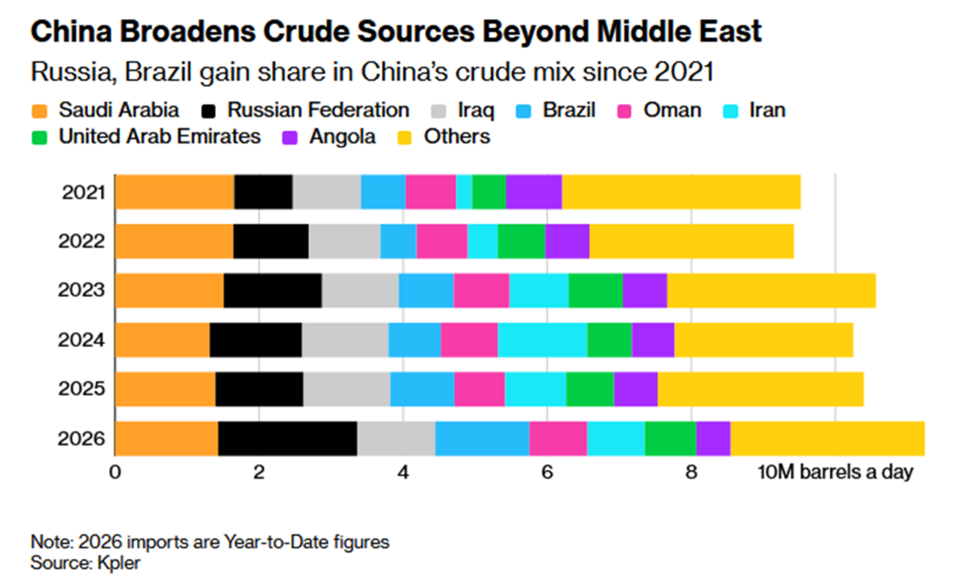 2、自2021年以来,中国原油进口结构持续调整,俄罗斯的供应份额已超越沙特阿拉伯,巴西的占比亦增长近一倍。该供应源多元化策略,结合创纪录的8.51亿桶陆上商业库存与可能高达14亿桶的总战略储备,为中国应对中东地区生产与航运中断提供了缓冲。同时,政府通过限制成品油出口及立法要求企业持有应急储备,进一步巩固了国内供应。