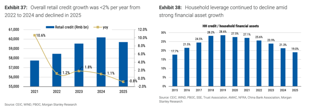 9、中国居民部门的信贷增速已低于经济增长,在2022至2024年间年均增速不足2%,并于2025年转为-0.8%的负增长。与此同时,居民收入在2024年仍有4-5%的正增长,且金融资产在过去数年保持了12%的增速。这种信贷收缩与资产扩张的并行状态,导致家庭杠杆水平持续下降,家庭信贷占金融资产的比例已从2019年28.6%的高点降至2025年的19.0%,其信贷风险正处于消化阶段而非累积阶段。