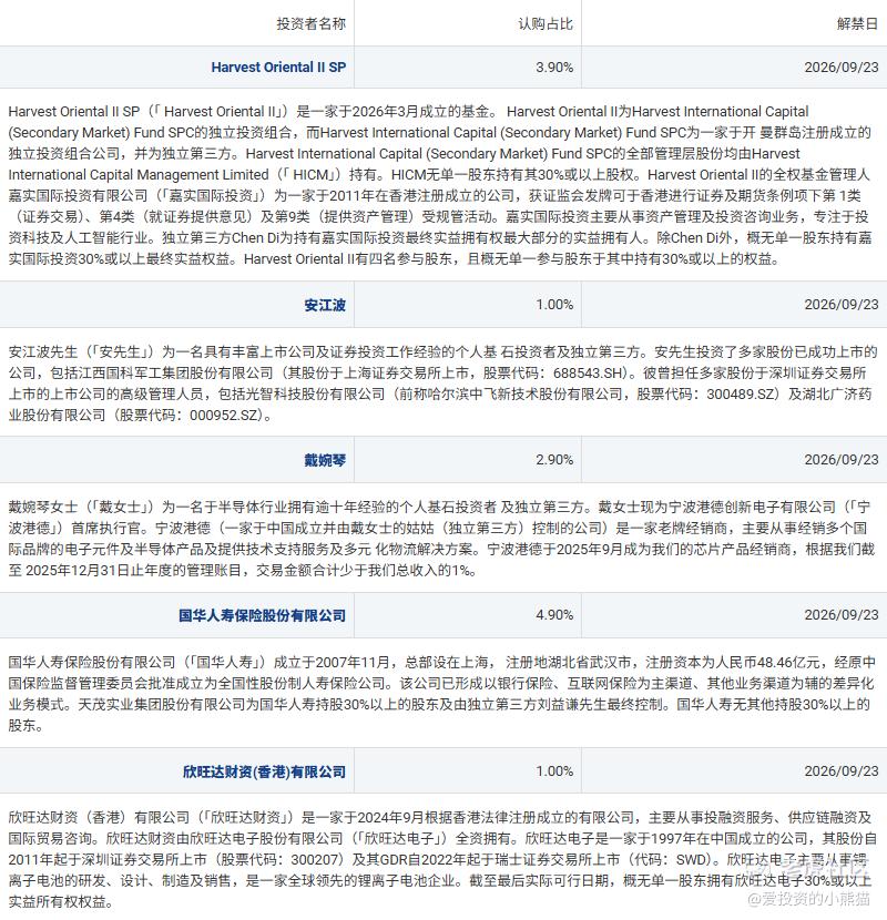 - 基石价值:引入国华人寿、嘉实、欣旺达等5家基石,合计认购约1.40亿港元,占比约13.6%,锁定期稳定市场情绪,尤其欣旺达作为产业链伙伴,强化业务协同与产业背书 。