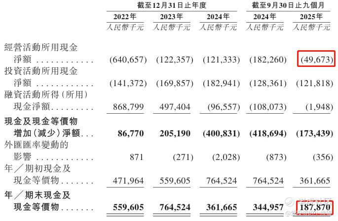 截至2025年9月30日,账上现金约人民币1.88亿元,营运资金变动前的经营现金流为-0.50亿元。