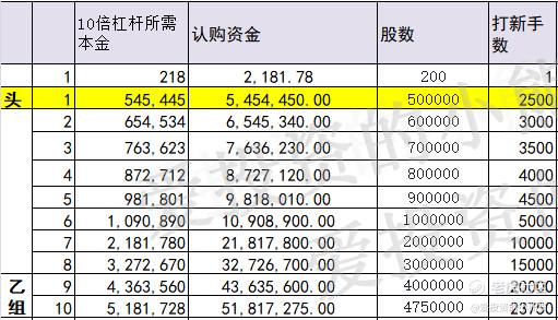 这个票甲尾437万,乙头需要认购资金546万,乙组的各档融资所需要的本金还有融资金额对应如下表: