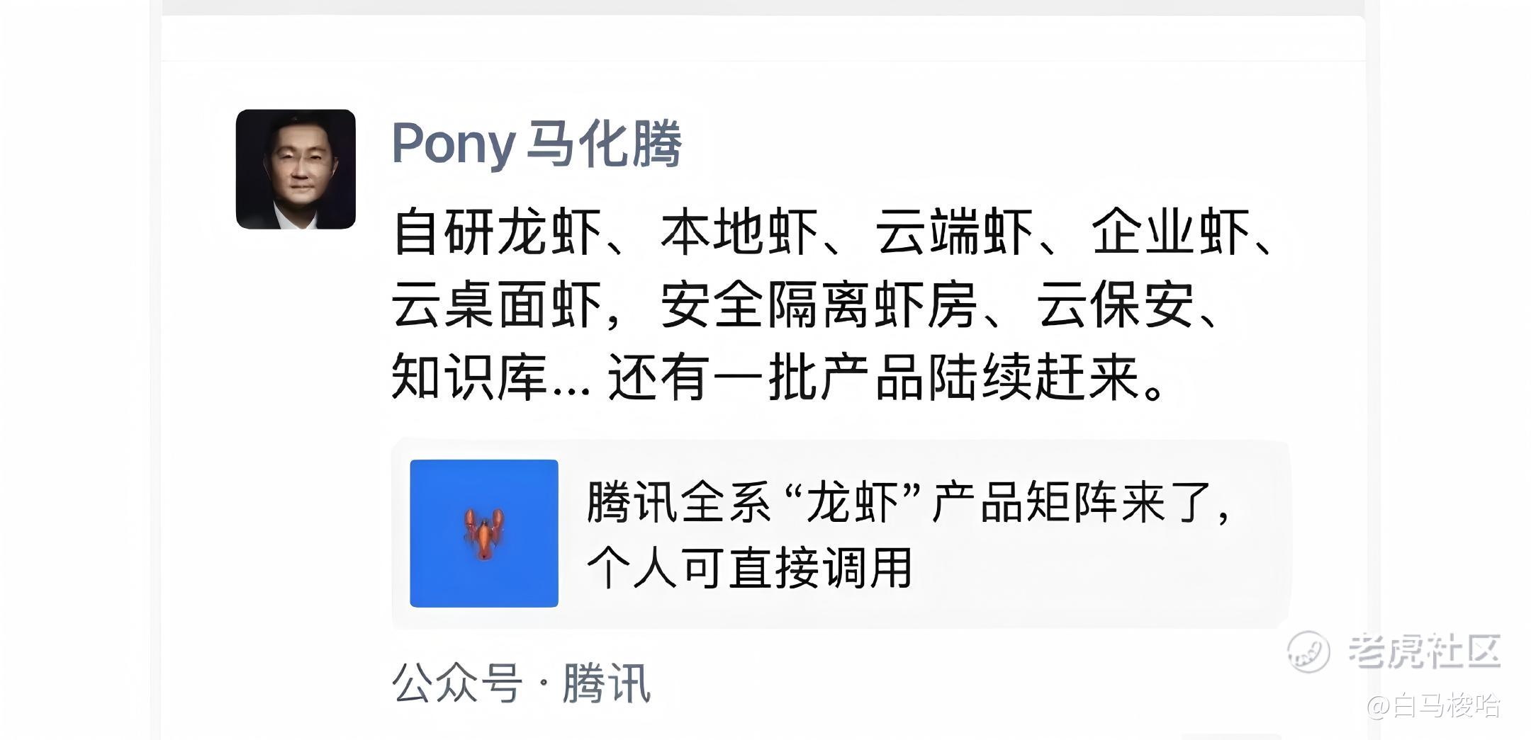“自研龙虾、本地虾、云端虾、企业虾、云桌面虾,安全隔离虾房、云保安、知识库…还有一批产品陆续赶来。”11日凌晨,马化腾还在发布朋友圈兜售龙虾产品。