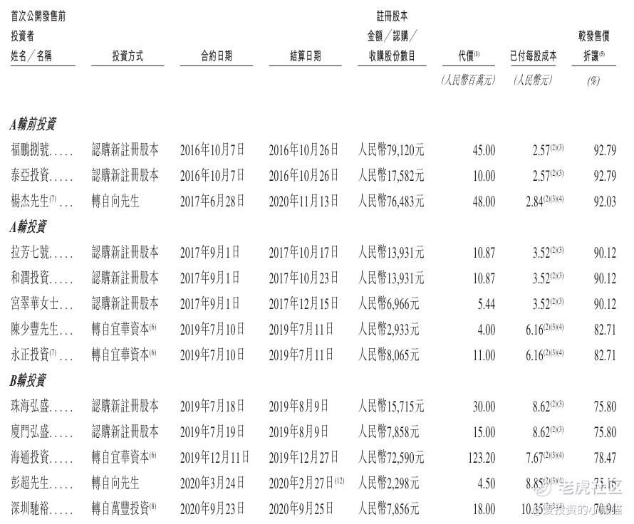 - B轮投资(2019.07-2020.09):珠海弘盛、厦门弘盛等融资4500万元,每股成本8.62元,折价率75.80%;海通投资股权转让融资1.23亿元,每股成本7.67元,折价率78.47%;彭超、深圳驰裕等融资2250万元,每股成本8.85-10.35元,折价率70.94%-75.16%,此阶段伴随业务扩张,估值大幅提升。