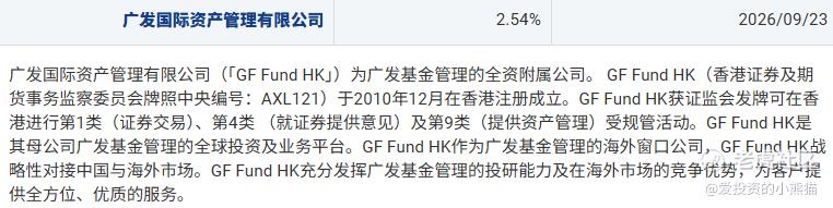 广发基金全资香港子公司,持有香港证监会1/4/9类牌照及QFII/RQFII资格,依托母公司公募投研优势,开展跨境资产管理业务。