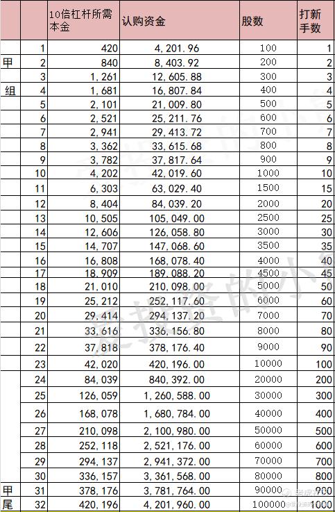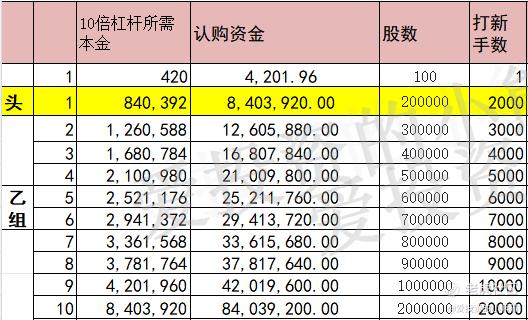 这个票甲尾421万,乙头需要认购资金841万,乙组的各档融资所需要的本金还有融资金额对应如下表: