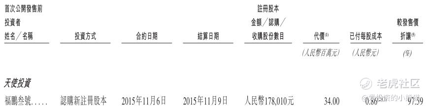 - 天使轮(2015.11):以3400万元认购178,810元注册资本,对应每股成本0.86元,折价率高达97.59%,为早期战略布局阶段,机构以极低成本获取核心股权。