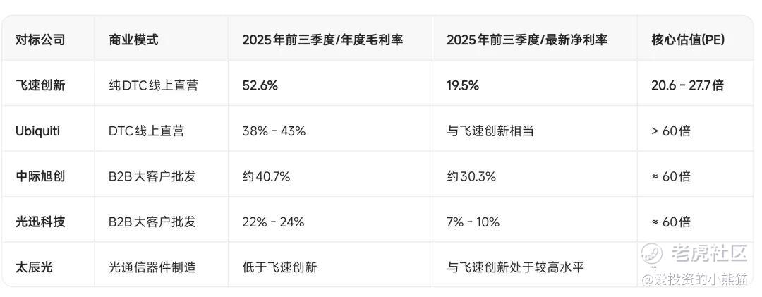 尽管飞速创新盈利能力强劲,但其估值仅为高增长AI光通信公司(中际旭创、光迅科技)或成熟DTC龙头(Ubiquiti)的不到一半。