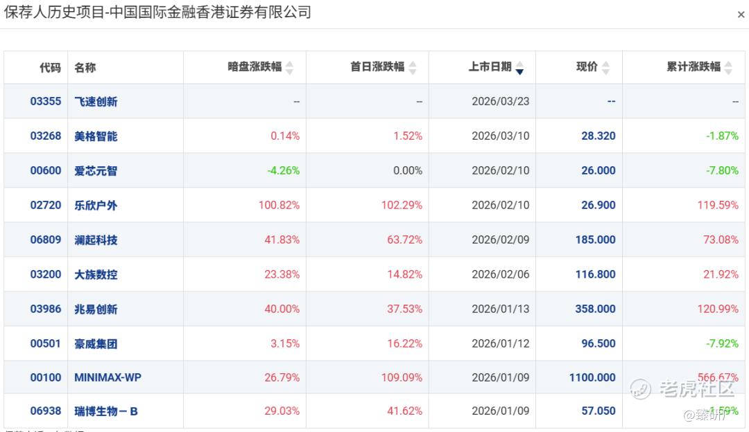 中金历史上作为保荐人参与了239个项目,其中暗盘有115家公司上涨,98家公司下跌,26家公司平盘,破发率41.00%,首日破发率36.82%。2026年以来共参与保荐了11个项目,其中仅1家暗盘破发,表现不错。
