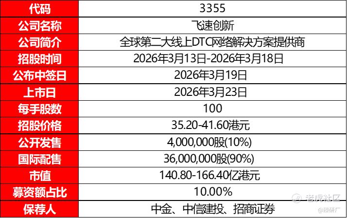 从市场情绪来看,目前共三只新股招股,时间冲突,带来了资金分流效应,而飞速创新优质的基石阵容、稳健的业绩增长、具备充足安全垫的估值以及绿鞋机制与低入场费会对市场认购热情起到正向带动作用。截至3月16日9:41,公配超购90.78倍,感兴趣的投资者可以持续关注项目后续的认购情况。