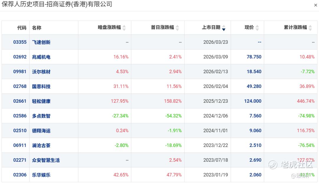 招商证券历史上作为保荐人参与了42个项目,其中暗盘有27家公司上涨,7家公司下跌,8家公司平盘,破发率16.67%,首日破发率23.81%,胜率较高。2026年以来参与保荐了3个项目,首日及暗盘均录得涨幅,表现较好。