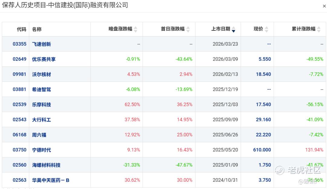 中信建投历史上作为保荐人参与了48个项目,其中暗盘有30家公司上涨,15家公司下跌,3家公司平盘,破发率31.25%,首日破发率27.08%。2026年以来仅参与保荐了2个项目,一涨一跌,累计涨幅均为负值。