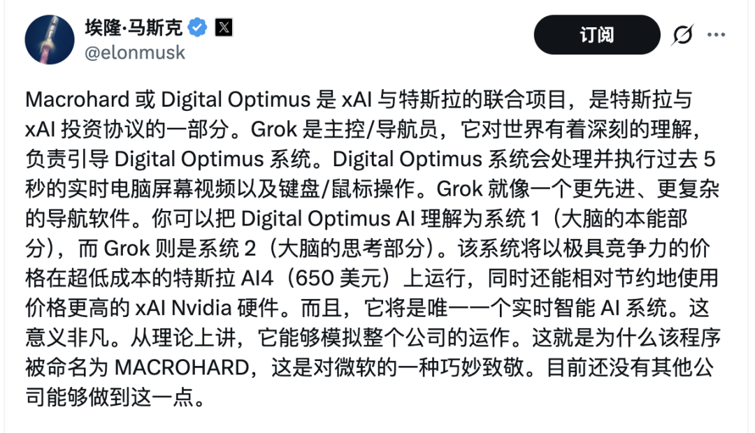 2026年3月11日,马斯克在X上发了一条帖子,宣布Tesla和xAI正在联合开发一个新项目,内部代号叫Macrohard。