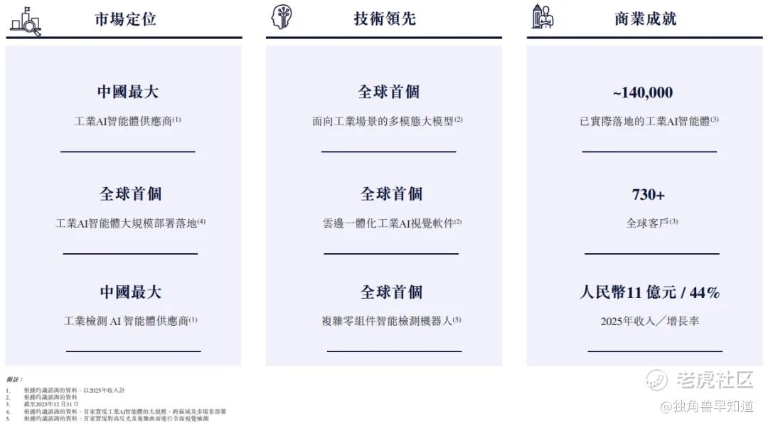 截至2025年12月31日,公司已累计向多个行业垂直领域,包括消费电子、新能源、精密制造、轨道交通及其他行业交付约140,000个尖端工业AI智能体。该等工业AI智能体已部署于客户的核心产品及生产流程中。截至2025年12月31日,公司的机器人已累计完成超过170亿件产品或零部件的检测。