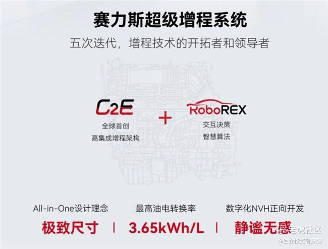 全新一代赛力斯超级增程系统,基于“赛翼(C2E)增程架构”与“RoboREX智能控制技术”赋能,具备静谧无感、高集成度、超高效率三大行业领先优势。“赛翼增程架构”采用All-in-ONE一体化设计理念,实现发动机与电机深度集成,控制系统集成,壳体集成,从而达到极致尺寸与成本控制。“RoboREX智能控制技术”颠覆性地改变了增程器的工作方式,由被动工作变成主动工作,实现智能主动能量管理。