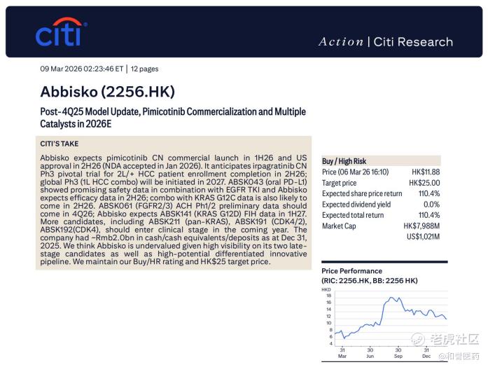近期,花旗发布了关于 $和誉-B(02256)$ 的最新研报。报告指出:公司核心产品匹米替尼(pimicotinib)商业化在即,依帕戈替尼(irpagratinib)等后期管线持续推进,多个创新项目预计将在2026年前后迎来重要里程碑。花旗认为,凭借两款处于后期阶段的核心产品以及具备差异化潜力的创新研发管线,和誉医药未来催化剂丰富、成长路径清晰,当前市值被低估,维持“买入”评级及25港元目标价。