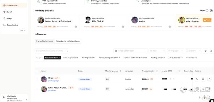 总结来说在执行端,AhaCreator 扛起一切繁琐重复的工作环节:自动联络达人,向达人发起邀约,自动梳理达人报价及详细数据供品牌筛选,自动与达人议价直到双方敲定,乃至提交物料、催促进度,直到最终内容完成交由品牌确认。 整个合作周期可以缩短至2周。