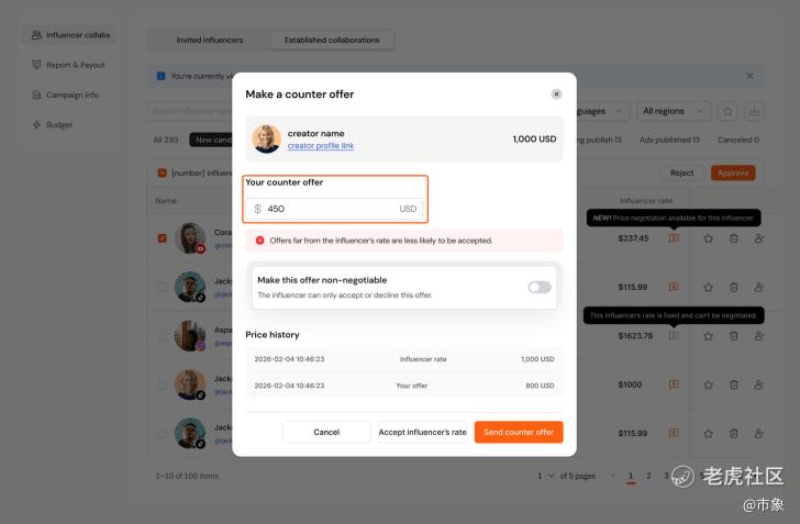 平台将原有模式升级为协商定价模式。达人表达接单意向后,会先给出自己的报价 ,品牌可以直接接受,也可以输入自己的预期价格,交由 AI 继续与达人沟通协商,直到双方达成一致。