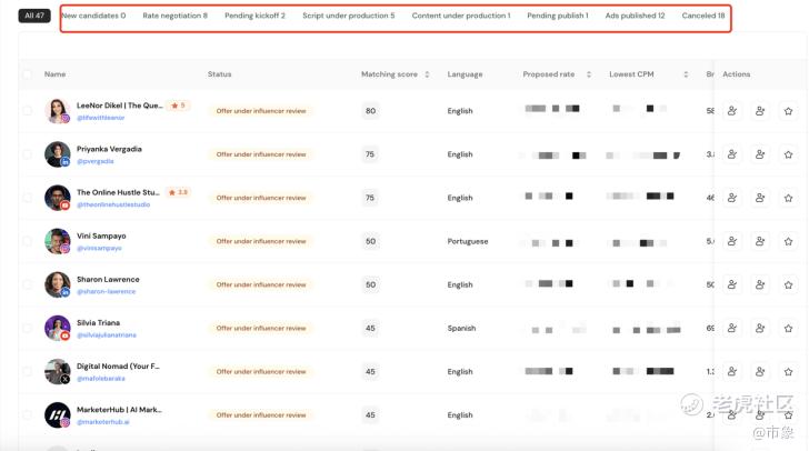所有已表达合作意向或正在议价中的达人,都会集中展示在「新候选人」列表中。品牌可以直接看到每位达人的订单状态、匹配分数、语言、报价、预估 CPM 和预估 Views,快速判断性价比与推进优先级。