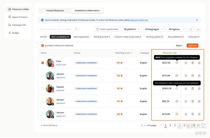 而且 Campaign 持续运行期间,达人会不断进入接单队列,供品牌选择的清单也会持续更新。对品牌来说,这意味着合作不是“一次筛完、一批做完”,而是始终有新候选人补充进来,确保合作节奏不断档,持续都能有内容释出。