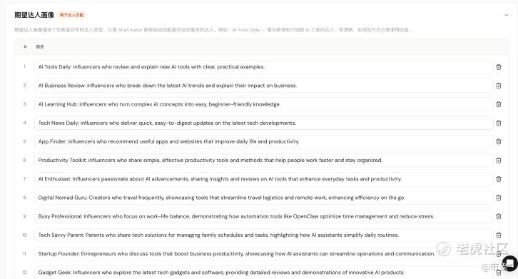 现在,AhaCreator将竞品及品牌希望合作的达人画像同时纳入匹配逻辑条件内。这些信息会和产品卖点、受众特征、投放平台、国家、语言一起,成为人选判断的共同因子。