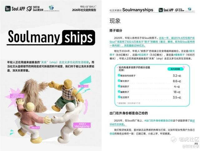 作为持续关注年轻人社交的新型社交平台,Soul App 已连续三年发布年度社交趋势报告。依托兴趣导向的连接机制,Soul沉淀了大量非颜值、深层次的互动样本;通过与学术机构的合作,将数据分析与社会研究方法结合,构建起稳健的研究体系。通过“研究—反馈—规则迭代”的循环机制,Soul App在理解年轻人的同时,也为其提供了更具安全感与确定性的社交元宇宙。