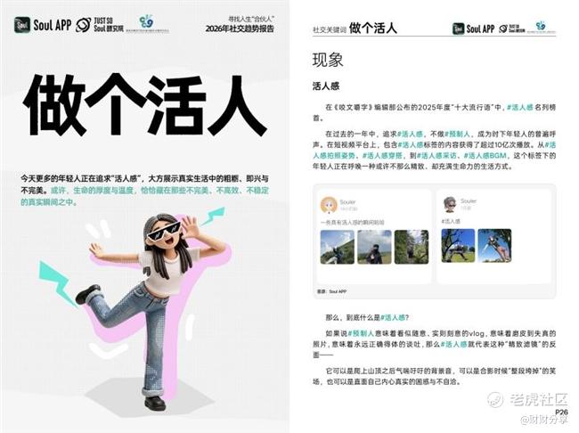 近期,Soul App旗下的 Just So Soul 研究院发布了《2026年社交趋势报告》(以下简称“报告”)。报告基于近万份有效样本调研,并结合平台多模态内容趋势分析,对年轻人的社交观念与行为方式进行了系统梳理。