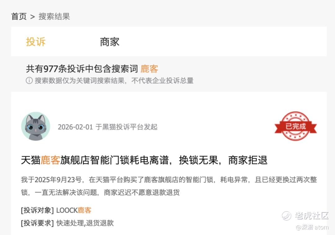 然而,市场领先和技术积累并不意味着鹿客的产品毫无瑕疵。在黑猫投诉平台上,以鹿客为关键词的投诉已达977条,投诉内容涵盖产品质量缺陷、售后服务差、虚假宣传等多个方面。比如,一位消费者在2025年9月23日购买的门锁耗电异常,虽然更换了两次门锁,但问题迟迟未能解决,商家也不愿意为消费者退货退款;此前,第一家电也报道过鹿客鹿客智能门锁因质量、售后问题被消费者投诉。