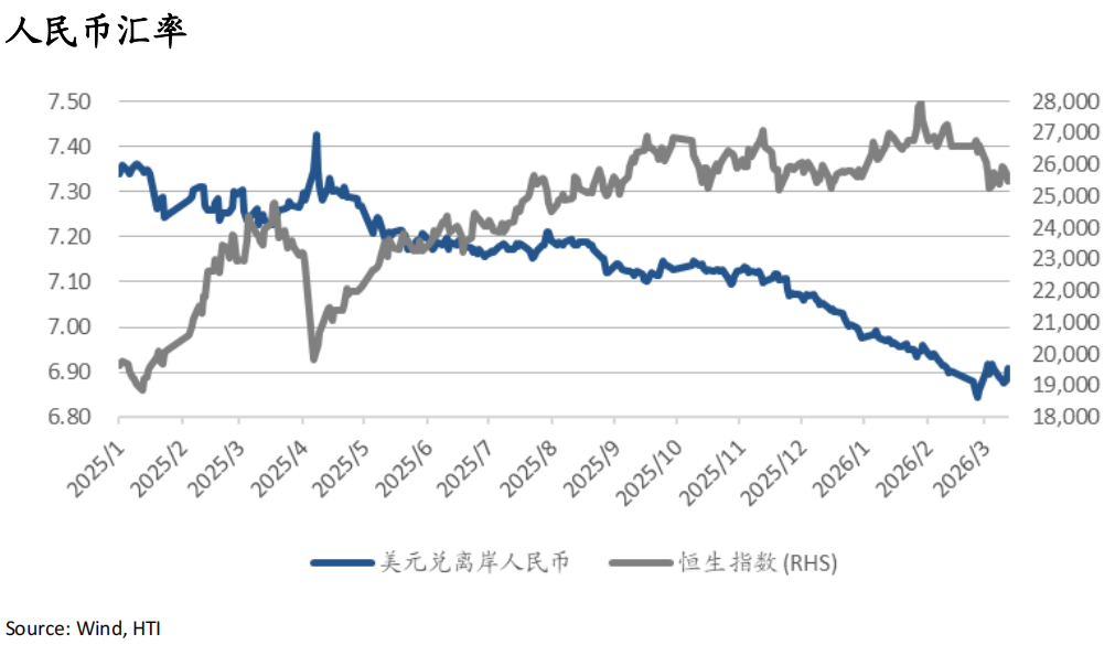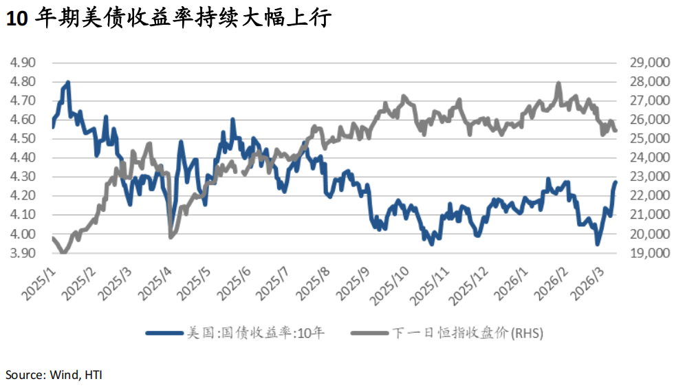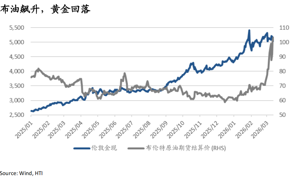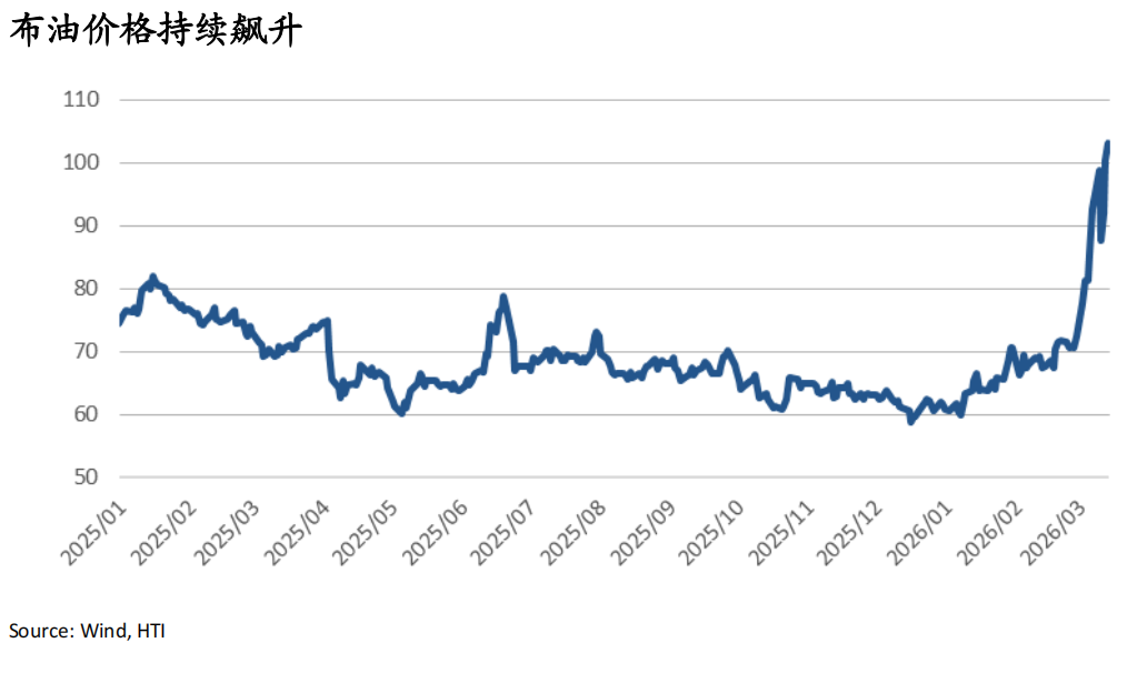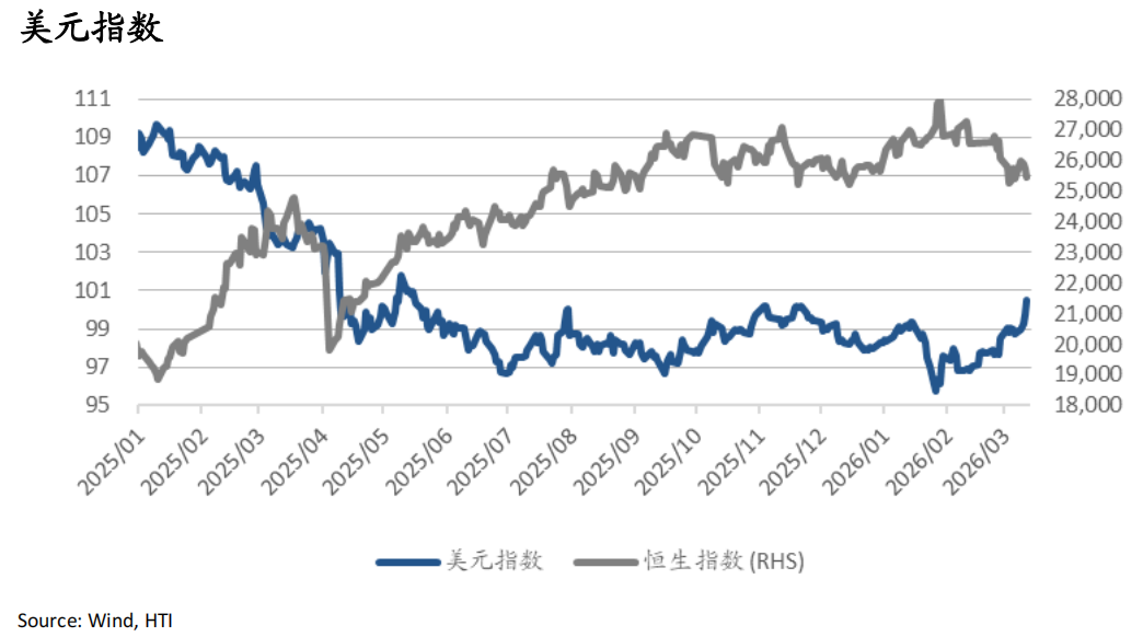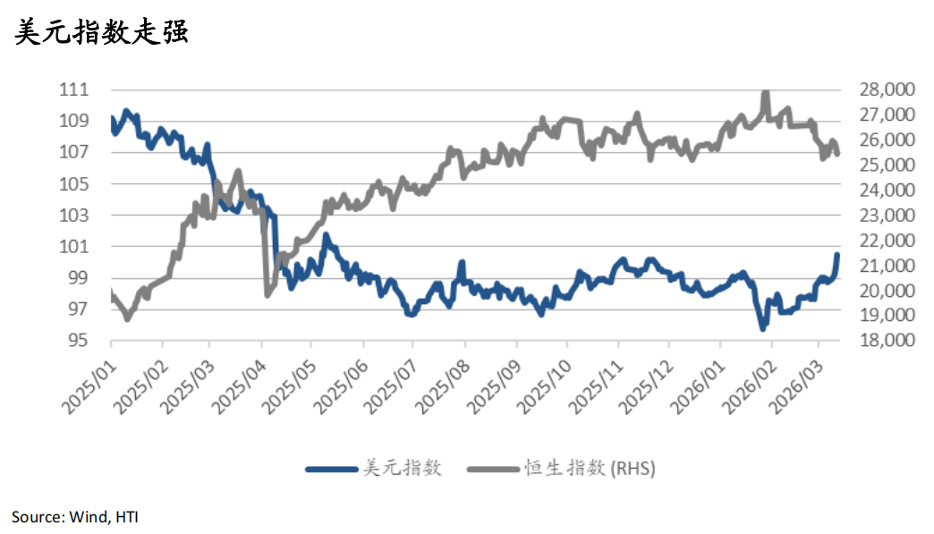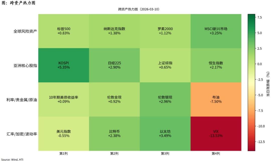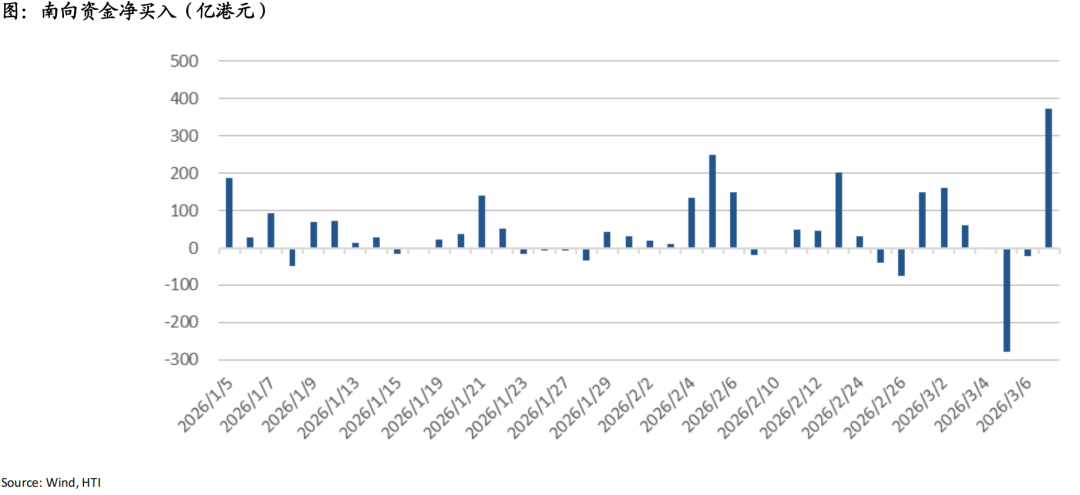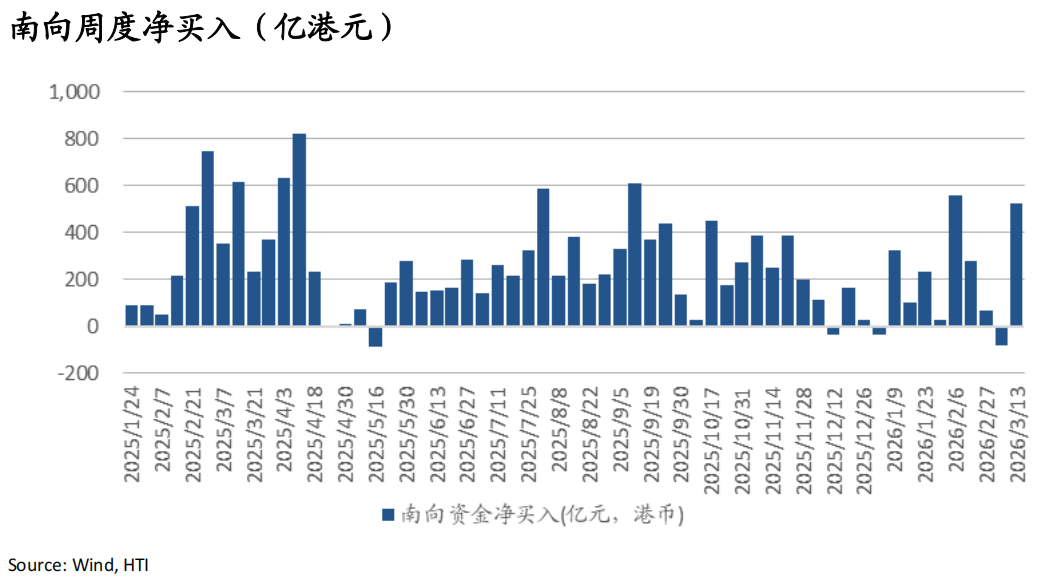 受地缘政治紧张局势催化,美元指数大幅走高并强势突破100整数大关,全周上涨1.6%至100.5,创下自去年11月以来新高。受特朗普“TACO”言论及随后美伊局势升级催化,布伦特原油上周回落后再度拉升,站上103美元/桶;贵金属表现承压,伦金全周下跌2.9%,白银周跌4.6%。港股资金层面,3/9-3/12南向资金转为大幅净流入524亿港元,3/5-3/11港股外资也维持净流入54亿港元。