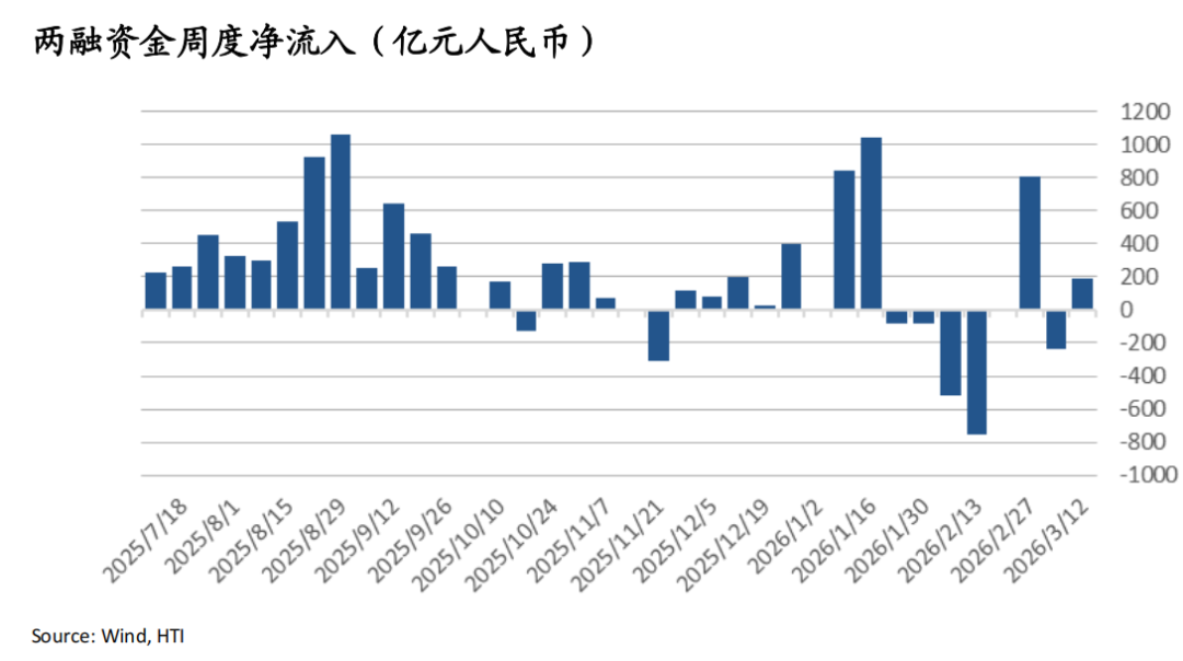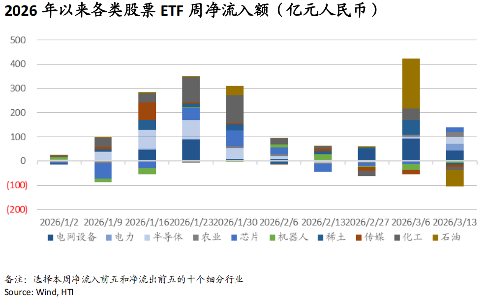 上周(3/9-3/12)两融资金转为净流入191亿元。ETF方面,资金分化明显:宽基 ETF延续净流出 257 亿元,行业 ETF仍维持净流入态势,净流入97亿元,其中电网设备、电力、半导体、农业ETF分别延续净流入44、28、28和20亿元,石油ETF转为大幅流出68亿元,化工、稀土ETF则转为净流出12、8亿元。