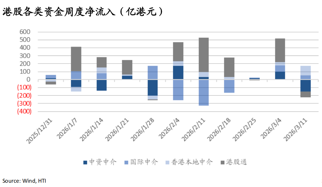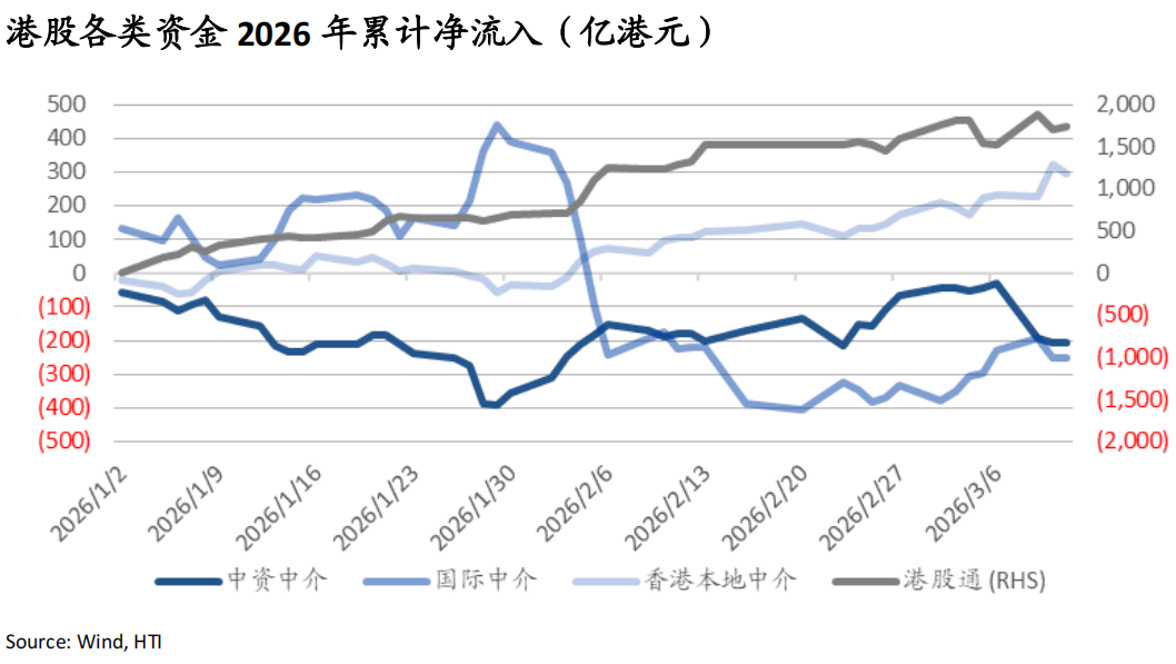 港股资金来源角度,2 月以来港股国际中介资金持续流出,而上周(3/5-3/11)港股外资继续净流入54亿,但年初至今仍累计净流出250亿, 香港本地中介资金也继续大幅流入122亿。