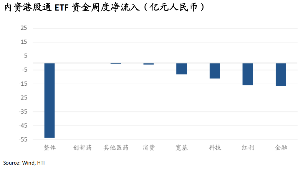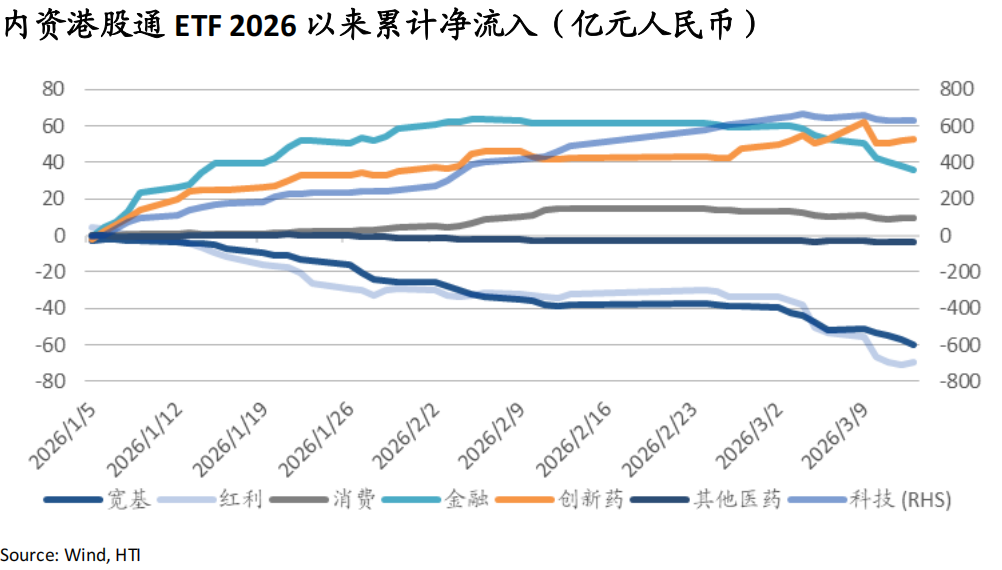 内资港股通ETF 上周继续净流出54亿元,其中科技、金融、红利、宽基板块分别净流出11、17、16、8亿元,仅创新药有小幅净流入;2026年年初以来全市场、科技、创新药、金融板块累计净流入595、630、53、36亿元。