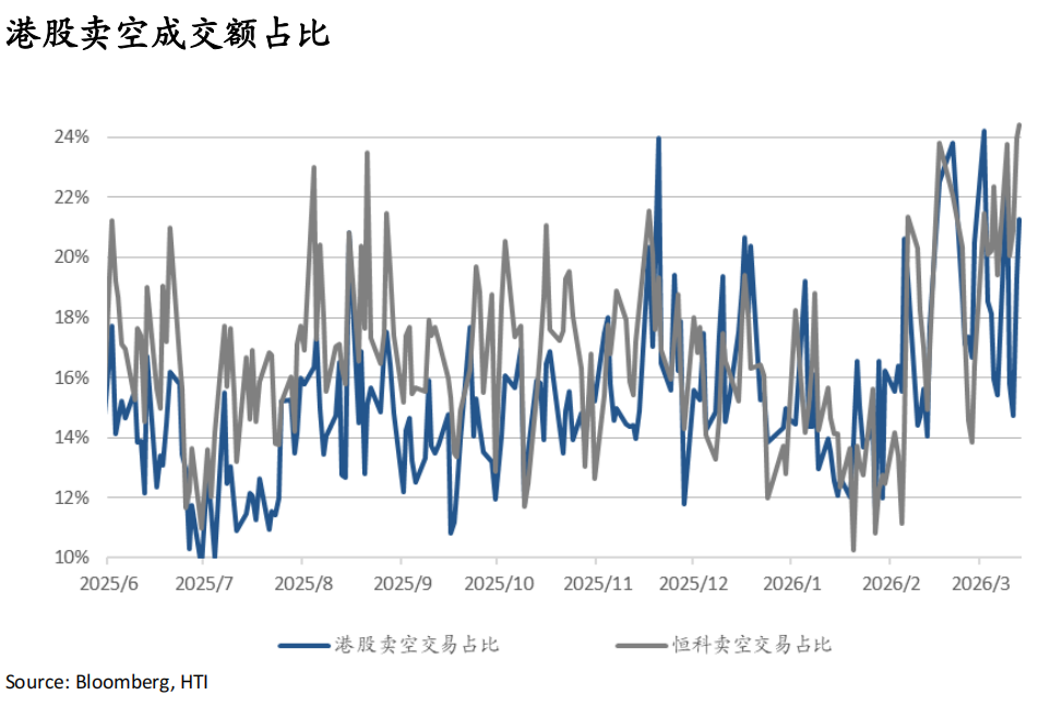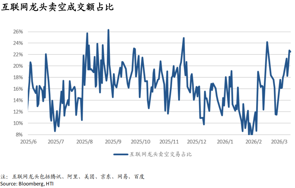 港股整体卖空成交占比上升至21%,恒生科技和互联网龙头卖空占比分别升至24%和22%。个股来看,腾讯、网易、美团、阿里、百度卖空成交占比较前一周升至18.8%、24.3%、34.9%、22.1%、35.2%。