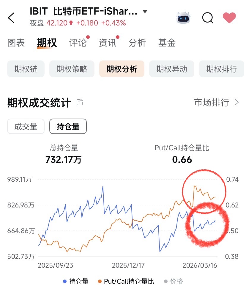 比特币为何现在进入是好时机?你去想,美伊战争开打,你作为伊朗的有钱人会怎么做?48-49年国民党撤出大陆时,没少带金银财宝吧,人性是一样的,那些来路不义的钱财短期洗不进银行,思来想去,比特币是唯一携带轻松,又相对安全,且可以到许多地方变现的渠道了。所以你可以看到比特币期货ETF BITO的交易量是在增加的,现货ETF IBIT的期权持仓量也在增加,P/C指数在下降,币安及coinbase上交易活跃度也在增加。