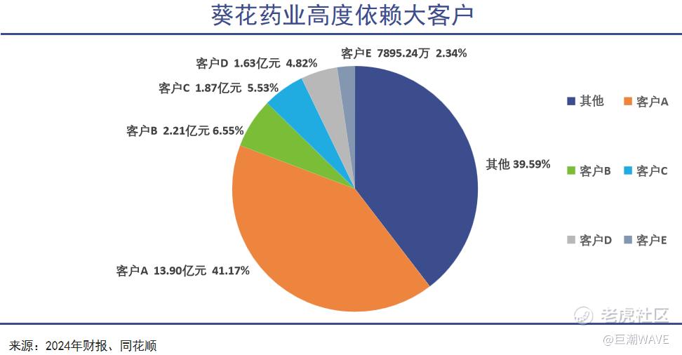在当年IPO时,葵花药业的大客户是九州通,目前尚未公布第一大客户信息。但第一大客户的销售额占比已经由2019年的21.73%提升至2024年的41%,贡献了高达18亿元的收入。