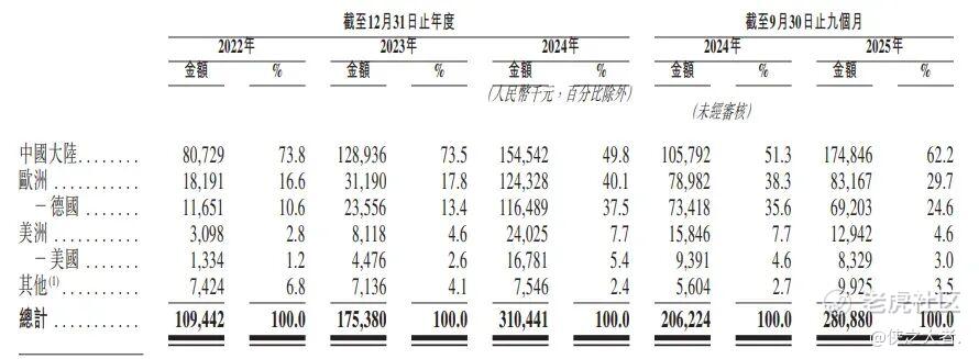 就地理覆盖范围而言,2022年和2023年以及截至2025年9月30日止九个月,大部分收益来自在中国大陆的销售网络,并在往绩记录期间迅速拓展海外市场业务。