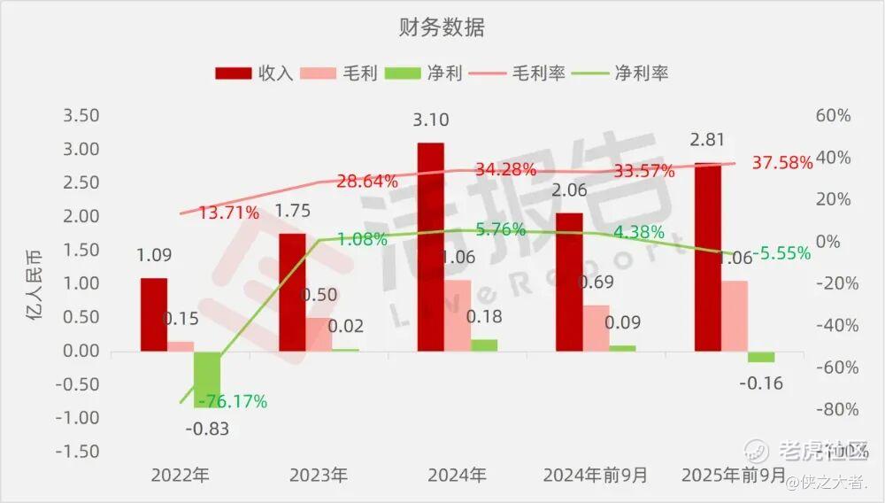 公司是一家协作机器人公司,2024年收入3.1亿元,净利润0.18亿元,毛利率34.28%;2025年前9月收入2.81亿元,净亏损0.16亿元,毛利率37.58%
