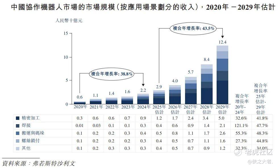 据弗若斯特沙利文(Frost & Sullivan)的资料,中国协作机器人市场由2020年的人民币6亿元升至2024年的人民币22亿元,复合年增长率38.8%。该市场预期于2029增长至人民币124亿元,自2025至2029年的复合年增长率为43.5%。