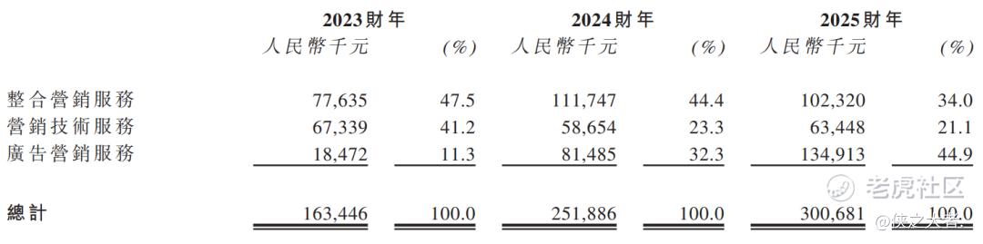 公司收入主要来自三大业务板块,其中广告营销服务为核心增长动力且占比最高,2025财年占比达44.9%,成为收入的重大组成部分;整合营销服务占比逐年下降,2025财年为34.0%;营销技术服务占比相对稳定且比例较小,2025财年为21.1%。