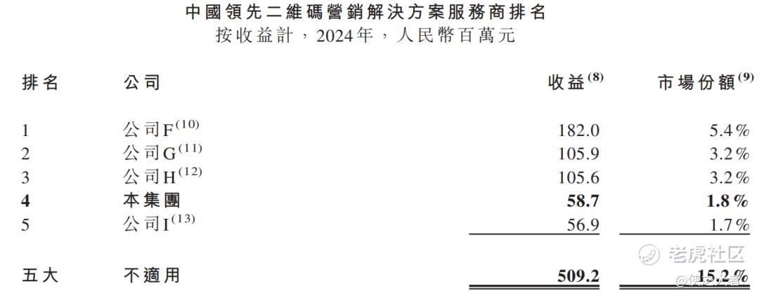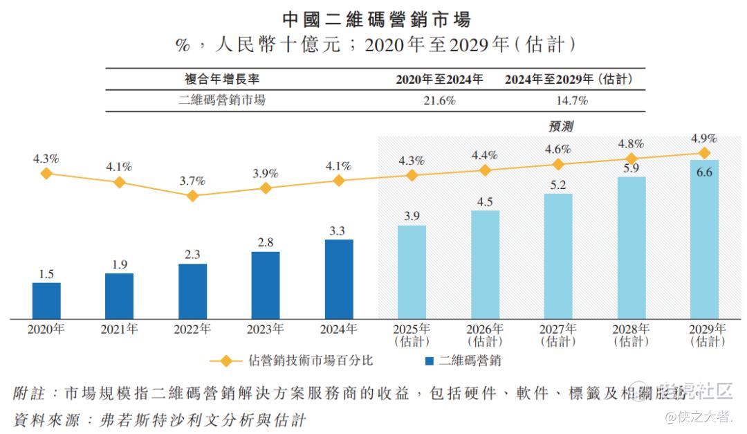 公司的营销技术服务主要借助自有系统在产品外包装及单个产品上嵌入二维码。根据弗若斯特沙利文的数据,按2024年相关服务收益计算,公司在中国二维码营销解决方案服务商中排名第四,市场份额约为1.8%。