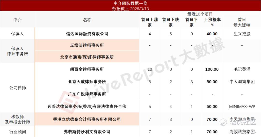 据**大数据统计,圣火控股中介团队共计9家,其中保荐人1家,近10家保荐项目数据表现欠佳;公司律师共计4家,综合项目数据表现不一。整体而言中介团队历史数据表现一般。